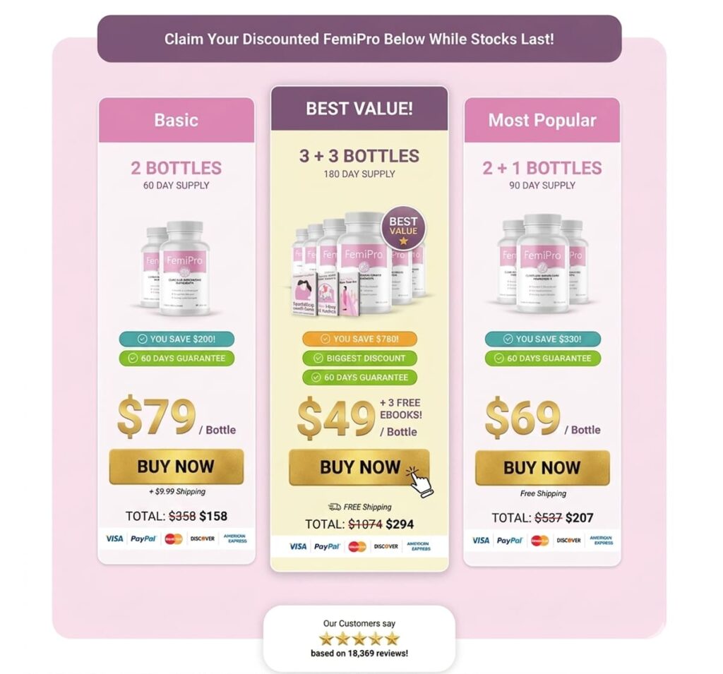 6 Bottles (180-Day Supply): The absolute best value. The price drops even further (often to $49.00 each), making it the ultimate femipro best price.