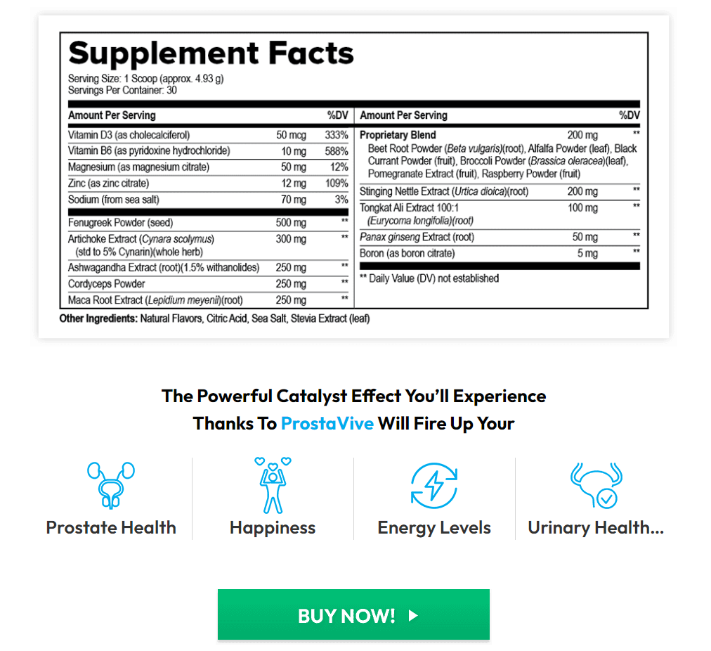 Each ingredient in ProstaVive was chosen to provide a comprehensive approach to men’s health. Together, these ingredients aim to support prostate function, improve energy, enhance libido, and provide an overall boost in quality of life.